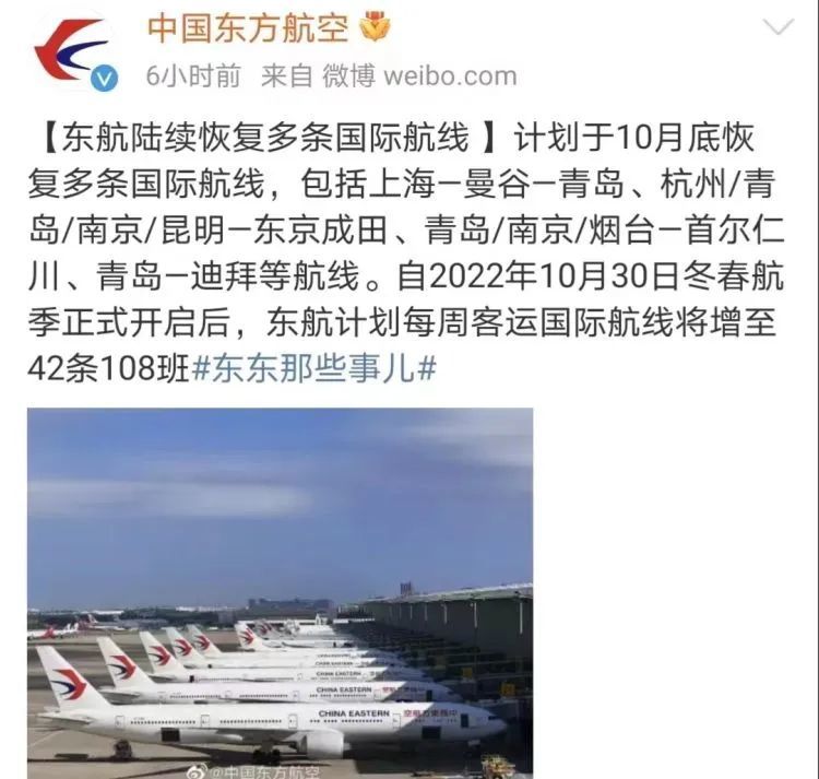 中国东方航空官方微博10月17日发布消息,东航计划于10月底恢复多条国际航线,包括上海—曼谷—青岛、杭州/青岛/南京/昆明—东京成田、青岛/南京/烟台—首尔仁川、青岛—迪拜等航线。自2022年10月30日冬春航季正式开启后,东航计划每周客运国际航线将增至42条108班。