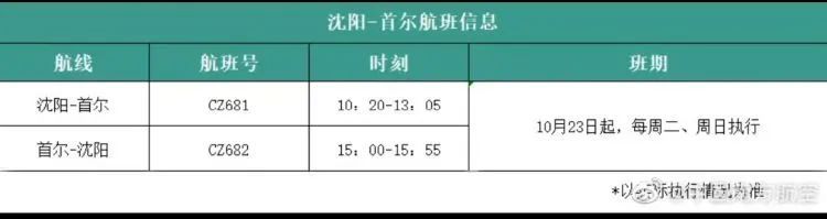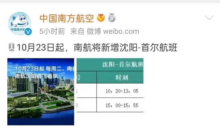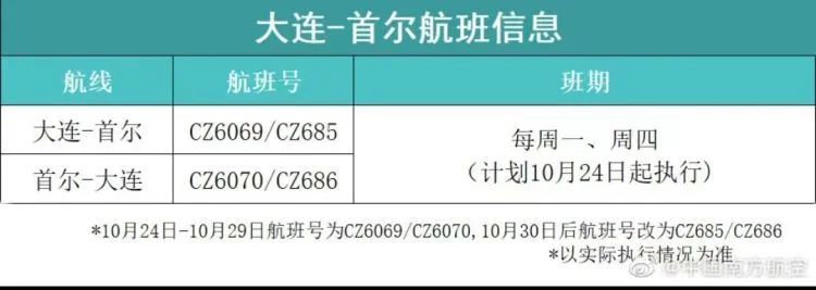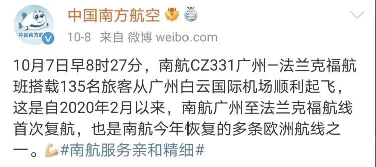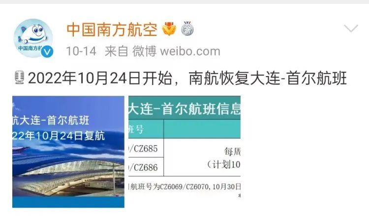 中国南方航空官方微博近日发布消息,10月7日起,南航恢复广州-法兰克福航班;10月23日起,南航将新增沈阳-首尔航班;10月24日开始,南航将恢复大连-首尔航班。