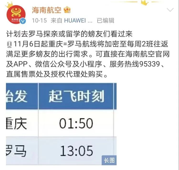 海南航空官方微博10月15日发布消息,为满足广大旅客国际出行需求,海南航空计划于11月6日起加密重庆—罗马直飞航线至每周2班往返,加密后的航线运力恢复至疫情前水平。